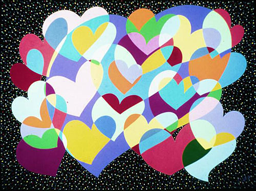 A galaxy of hearts popping with excitement and bliss, all throbbing with interpenetrating colors of the rainbow, pulsating on a cosmic background of endless stars.