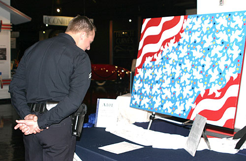 An LAPD officer having a close look at Metin's GOD BLESS AMERICA painting