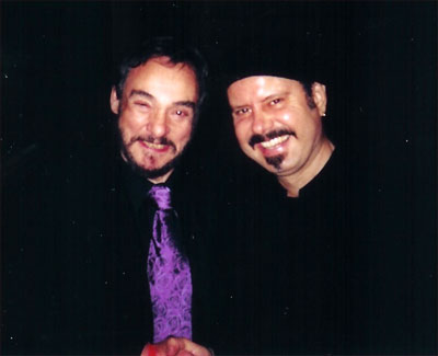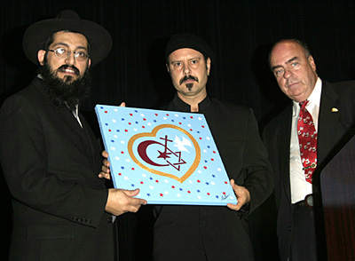 (ABOVE) Metin presenting his original hand-painted canvass representing the brotherhood of all major world religions to Rabbi Shimon Kashani (left) and Arthur M. Kassel (right), a well-known Hollywood producer.